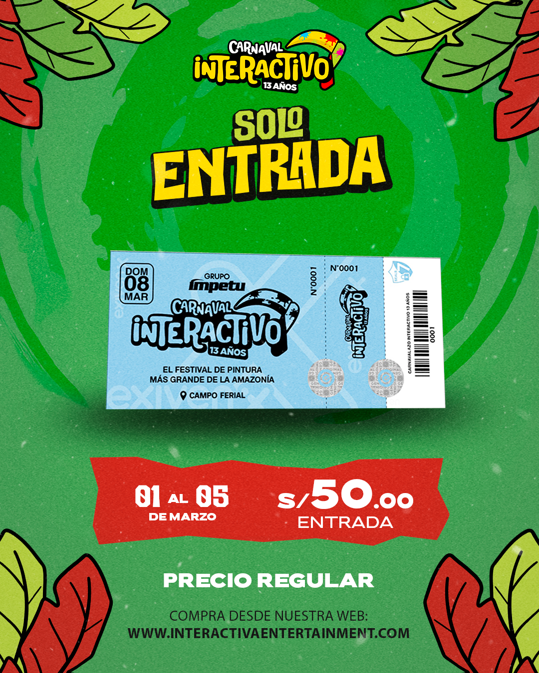 Entrada oficial al XIII Carnaval Interactivo, válida para vivir una experiencia única en el festival de pintura más grande de la Amazonía. Disfruta de música, color, arte y diversión en un ambiente seguro y lleno de energía. Acceso al evento en el Campo Ferial el domingo 8 de marzo. Cupos limitados.